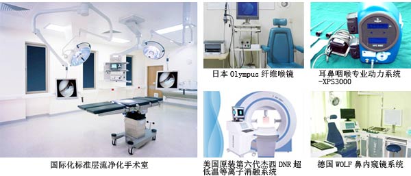 20余套尖端设备的引进,例如,引进的美国DNR低温等离子消融系统、日本奥林巴斯纤维鼻咽喉镜成像系统、STORZ鼻内窥镜、WOLF手术影响系统、蔡氏手术显微镜、丹麦 听力检测系统和电脑微波治疗系统等一系列前沿水平的诊疗设备。