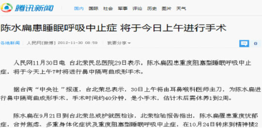 腾讯网11月30日报道:陈水扁患睡眠呼吸中止症,今天上午已入院接受治疗。