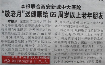 在重阳节来到之际,陕西老年报社联合县西安新城中大耳鼻喉医院将开展“关注健康,关爱老年人”的健康援助活动。决定在10月18日至10月31日期间,由级著名耳鼻喉教授来长荣(历任市耳鼻喉科主任)、张全安(历任西安医学院二西安新城中大耳鼻喉医院耳鼻咽喉科主任)等三十多位教授组成的医生团队,开展对全省65周岁以上老人“敬老月”大型健康援助活动。