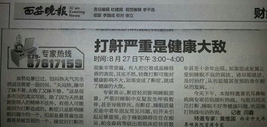来长荣受邀《西安晚报》鼾症科普解答医生热线