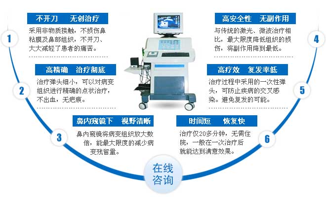 【三、原理诠释】微创手术,20分钟无痛告别各种鼻炎微创手术消融仪是美国、英国、法国、意大利、等欧美发达目前首选的耳鼻喉治疗设备,它是继激光、微波、射频等高温聚焦治疗原理之后的代技术,美国已经全面取代微波技术而采用等离子技术。微创手术的治疗原理是低温消融,即利用微创手术,以较低的温度对病变组织进行消融该技术只需在40-60摄氏度下操作,整个治疗过程仅20多分钟。非常适合事务繁忙和对疼痛敏感的人士。