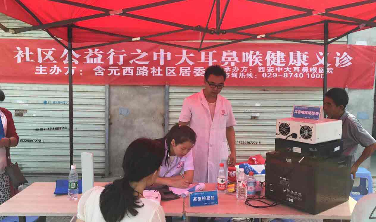 “今天的太阳这么大,你们这么早就过来给我们看病了。真的不知道该如何感谢你们了。”住在西安新城区含元西路社区的谢阿姨看着医护人员架好遮阳棚摆着医疗器械感慨的说道。为了让居民能更加了解自己的身体状况,及时做健康检查。2015年8月28日上午,西安新城中大耳鼻喉医院接到西安新城区含元西路社区居委会的邀请,为居民免费义诊,进行耳鼻喉健康体检。